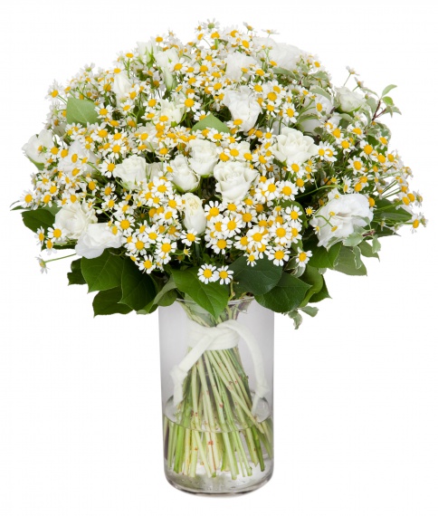 Состав: Салал - 20, Танацетум - 15, Питтоспорум Нигра - 2, Роза кустовая белая - 7, Эустома белая - 5