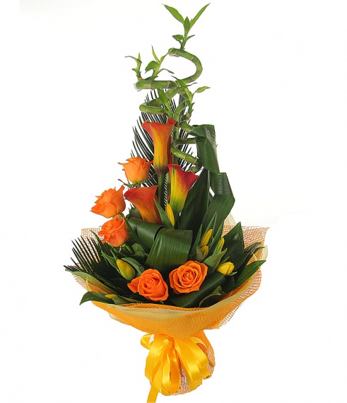 Состав: Салал - 20, Бамбук - 3, Аспидистра - 3, Калла манго - 3, Цикас - 2, Аралия - 2, Роза Вау - 5, Тюльпан желтый - 7